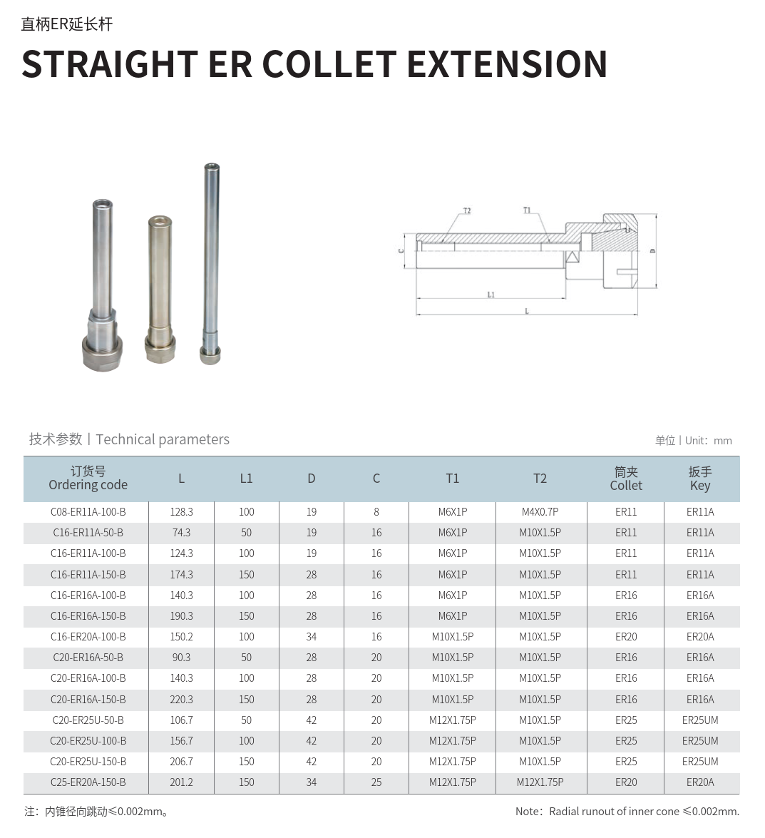 ER 延長桿與 ER 筒夾、ER 螺帽、ER 板手 搭配使用,可有效延長刀具,並保持高剛性與穩定性,廣泛應用於航太、汽車、模具、電子與精密機械加工領域。