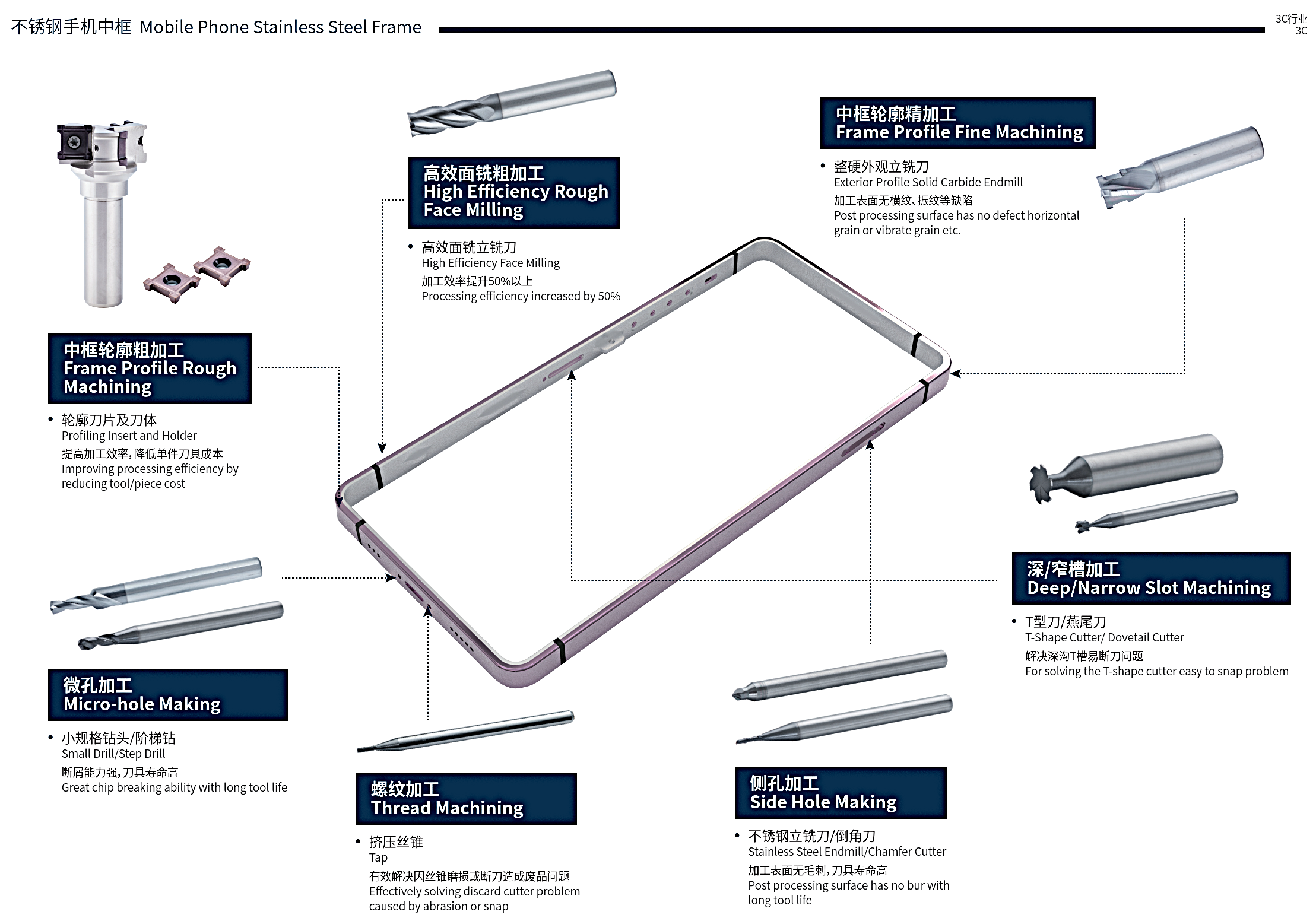 3C電子產業涵蓋消費性電子、通訊、精密零組件、半導體與光電模具等多個高技術領域,加工件普遍具有體積小、結構精密、容錯率低的特性,加工材料更包含大量硬脆性或複合性材質,對刀具提出高轉速、高精度、高穩定性的綜合要求。