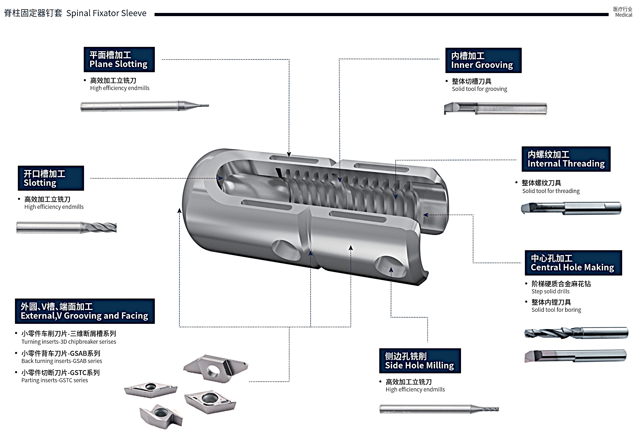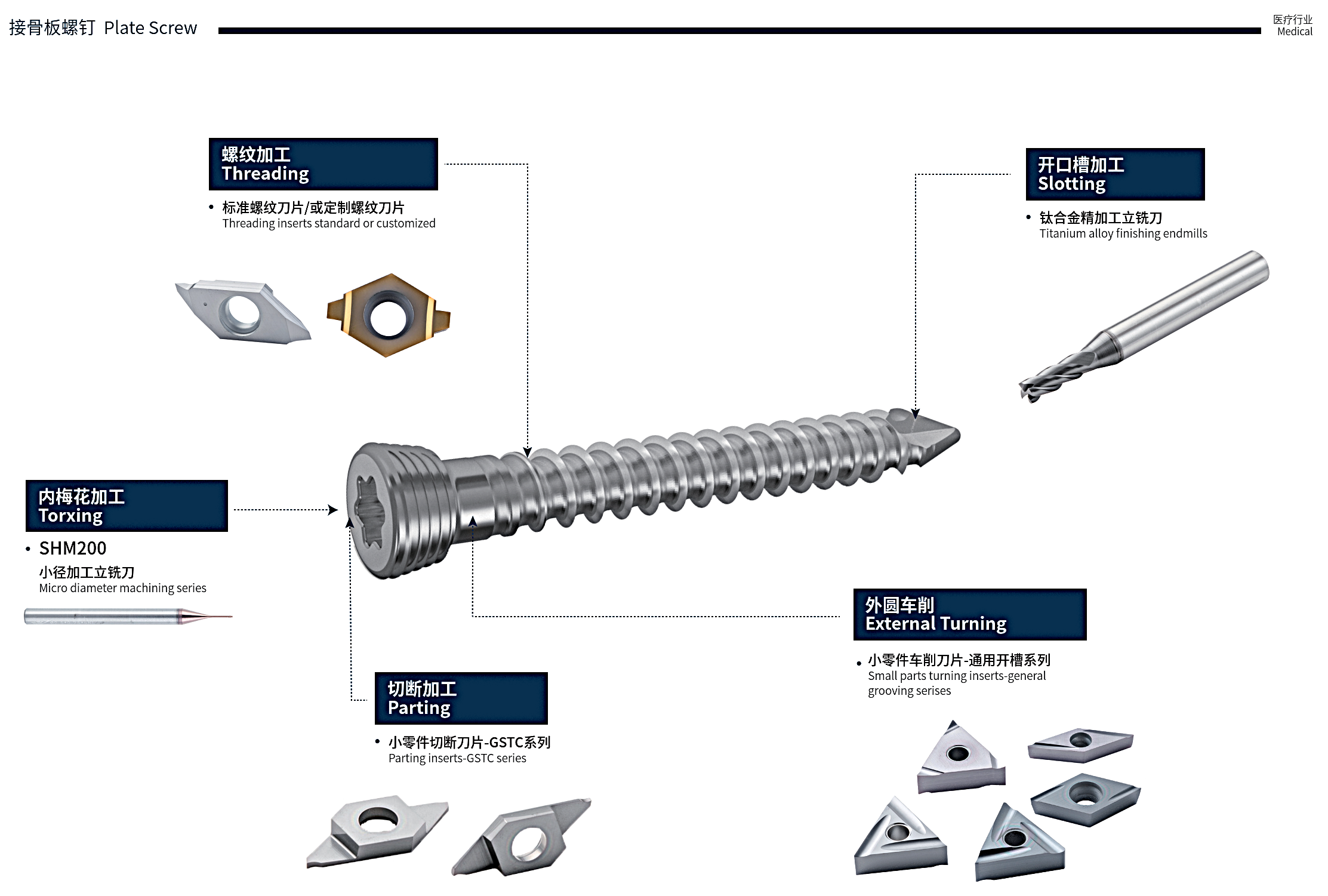 醫療產業對加工品質、潔淨度與零件一致性要求極高,零件多為高精密、小尺寸、複雜曲面與難加工材質,廣泛應用於手術器械、骨科植入物、牙科器材、生物醫療裝置與診斷設備等關鍵部件。加工過程中需兼顧高精度、高表面品質與生物相容性材料的穩定切削。