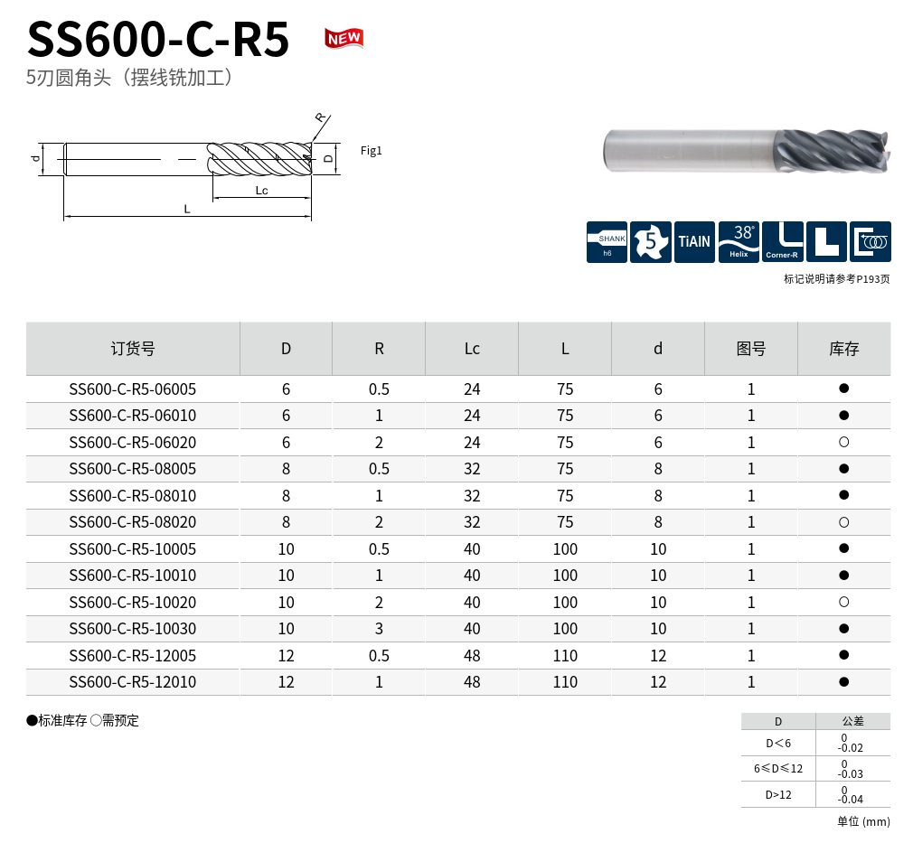 SS600 採用高強度鎢鋼基體,並搭配高耐熱性的 TiAlN 鍍層,專為加工高強度金屬材料而設計,如高強度鋼、沉澱硬化不鏽鋼、鈦合金等。具備 SS600-R5 特殊圓角刃口設計,大幅強化刃部強度與抗崩性,特別適用於擺線銑削、高效加工與精加工等高負載應用。