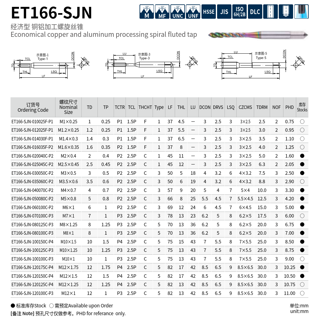 ET166-SJN 是專為銅合金及鋁合金材料設計的 經濟型螺旋絲攻(Spiral Flute Tap),具備優異的排屑性能,特別適合盲孔加工。刀具採用螺旋槽結構,有效將切屑排出孔外,降低切削阻力,提高攻牙效率與穩定性。此款刀具性價比高,適合中小批量及維修加工需求。