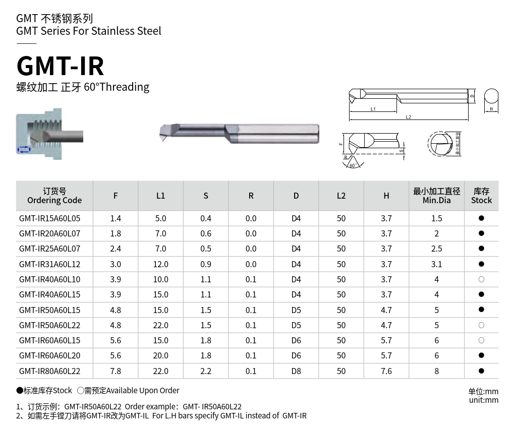 GMT-IR 系列為整體鎢鋼材質製成的小徑內孔內螺紋加工專用刀具,適用於60° 或 55° 標準牙型(如 ISO、UN、BSW 等)。刀具設計專為不鏽鋼等高韌性材料打造,具備良好的抗崩刃性與排屑能力,搭配高性能抗黏屑塗層,有效降低加工熱與積屑瘤風險。