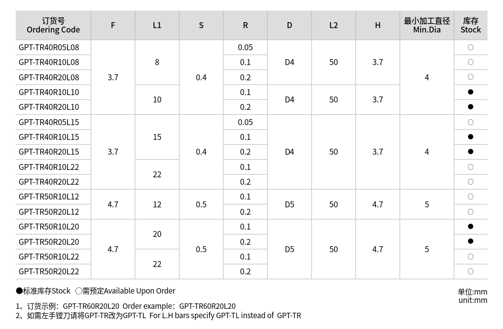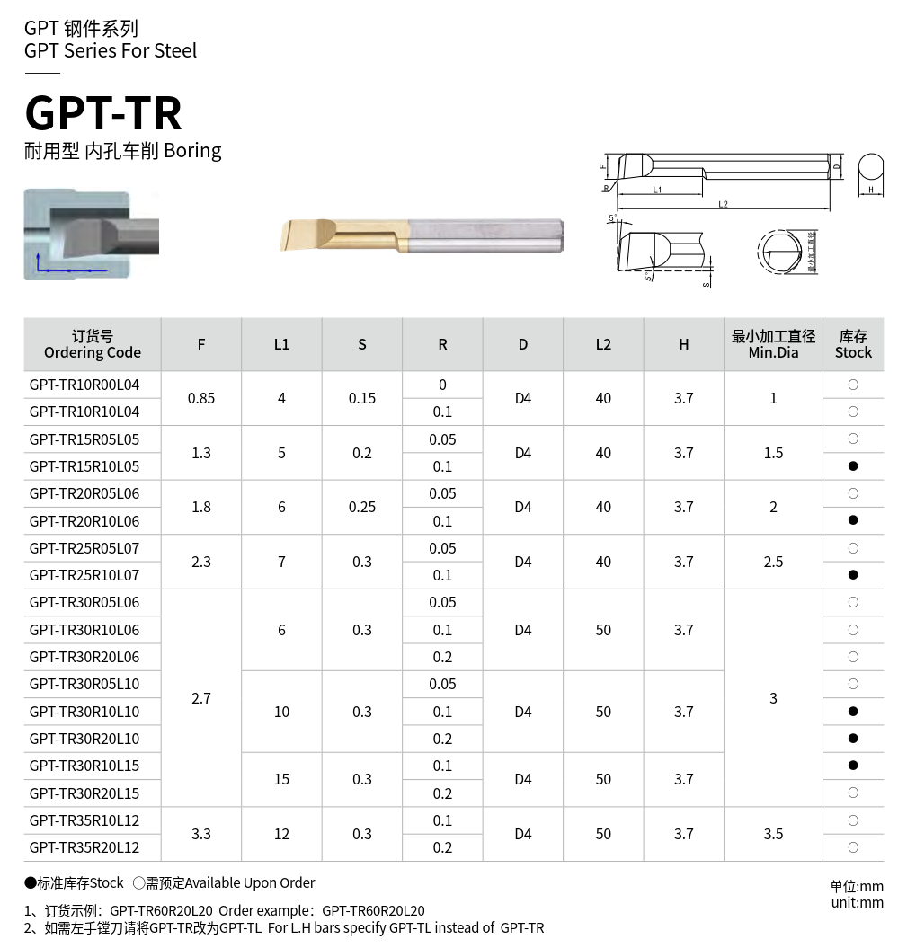 GPT-TR 是專為普通鋼材(如碳鋼、合金鋼)設計的小徑內孔搪孔型整體鎢鋼刀具。其刀頭角度與切削幾何經精密優化,可有效進行高精度內孔修整與尺寸精修,確保孔徑達到嚴格公差要求。結合高硬度鎢鋼基體與適用於普通鋼的高效塗層(如 TiAlN),可延長刀具壽命並維持穩定加工表現。