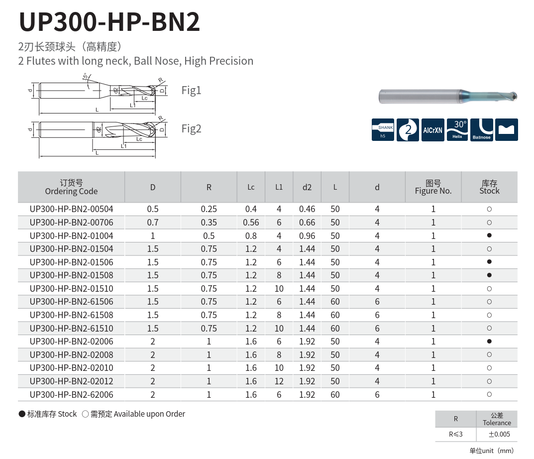 UP300 鎢鋼球刀專為普通鋼與鑄鐵材料(硬度<52HRC)之三維曲面與複雜輪廓加工設計。採用高韌性鎢鋼基體,結合自研 AICr 系高性能塗層,兼具耐磨性與抗熱衝擊能力,顯著延長刀具使用壽命。新增高精度型號,具備卓越的球頭輪廓控制能力,特別適用於模具類的高速高精度掃描加工與精加工應用,提供穩定、精細的切削效果。