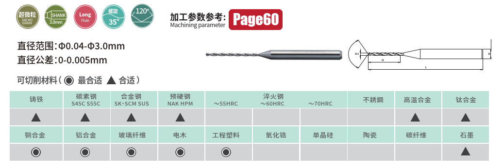 特別針對工程塑膠、鋁合金、銅材、黃銅等非鐵金屬材料優化,適用於高速主軸及微細加工設備,是高效能、高精度微小孔加工的理想選擇。