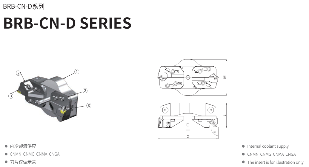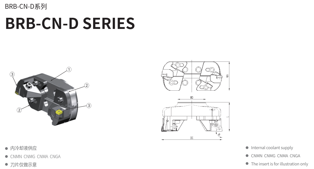 刀夾可裝載多款 ISO標準刀片(包括 CNMN、CNMG、CNMA、CNGA),通用性強,便於使用者根據工件材質與加工需求靈活搭配刀片。支援軸向與徑向雙向調整,加上內建內冷卻液供應通道,大幅提升加工穩定性與刀片壽命。鏜孔精度控制在 ±0.05mm 以內,兼顧高效率與尺寸精度。