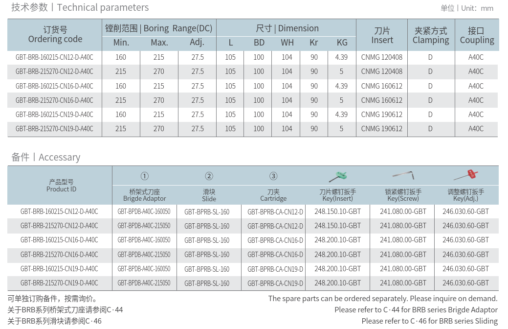 BRB系列粗鏜刀採用壓板式(Platen)刀夾結構,專為 Φ160mm 至 Φ510mm 的大型孔徑鏜削而設計,適用於重切削條件與高剛性需求的工件加工。刀體採用航太級鋁合金橋架,具備重量輕、剛性高的特點,可顯著降低主軸負載,有效延長機台使用壽命。