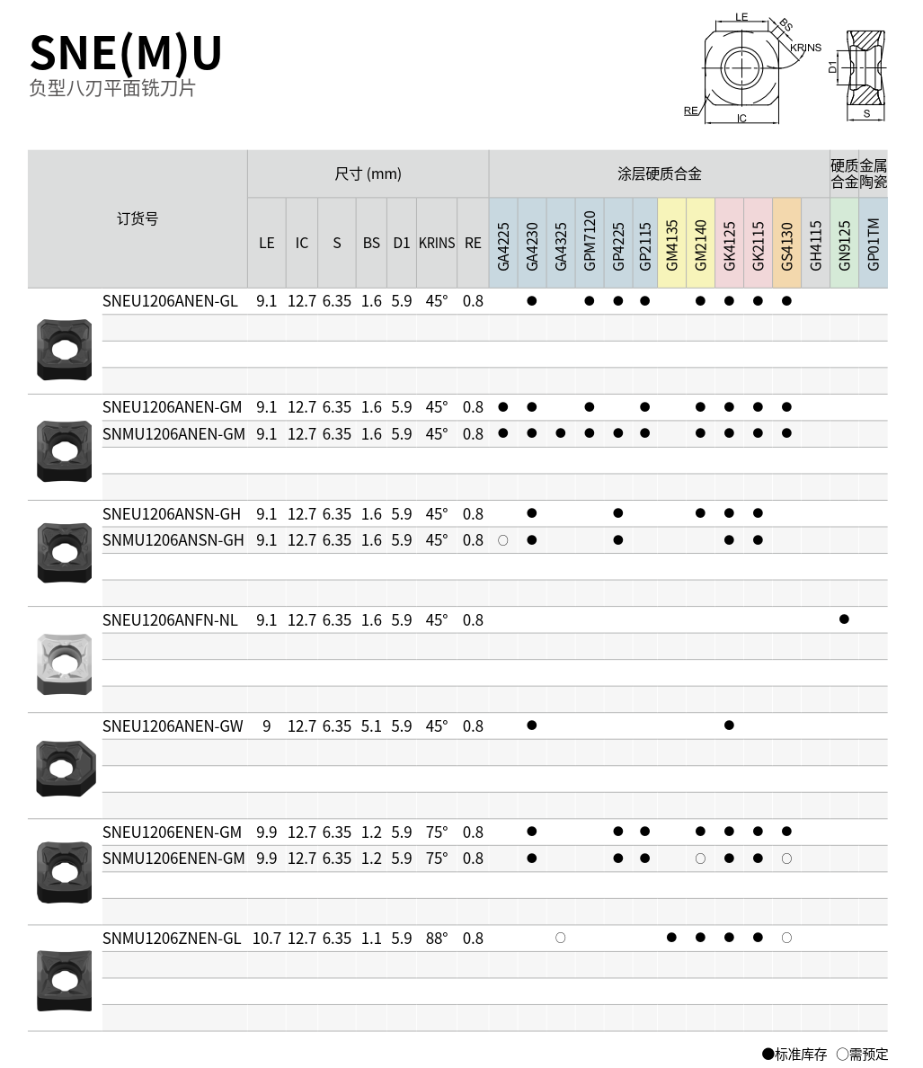 SNE(M)U 負型八刃面铣刀片 採用 雙面加厚設計,具備 8個高強度切削刃口,專為重負荷及高穩定性加工需求而設計。其負型結構使刀片具有出色的剛性與抗衝擊能力,特別適合中大型零件的 粗加工至半精加工