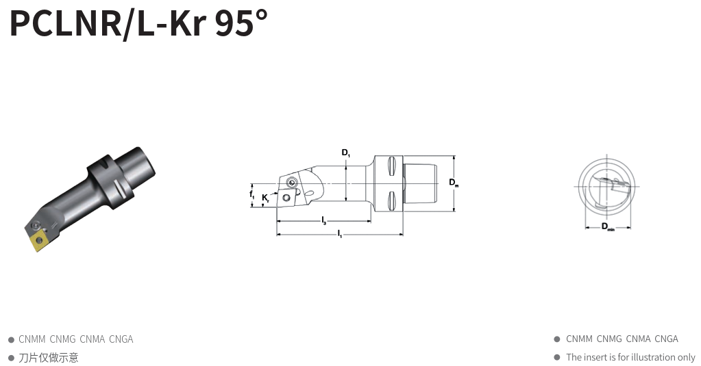 PCLNR/L-Kr 系列為配合 CAPTO(PSC) 精密快換系統 所設計的高剛性內圓車刀體,搭配 CN 系列可轉位刀片 使用。此系列以 95° 主偏角設計,兼顧切削穩定性與加工靈活性,適用於一般內孔的粗、精加工。